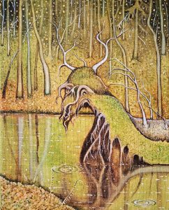 Working primarily with acrylic on canvas, Lindberg focuses on landscape painting. For many years, he has explored the theme of water in its various forms, particularly reflections on lake surfaces. More recently, his artistic interest has turned to mountainscapes, including waterfalls, mist, glaciers, and cloud formations at the peaks.
