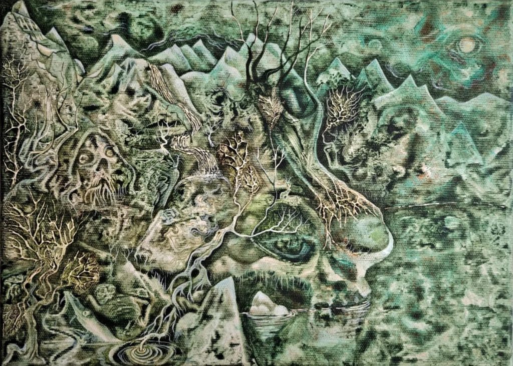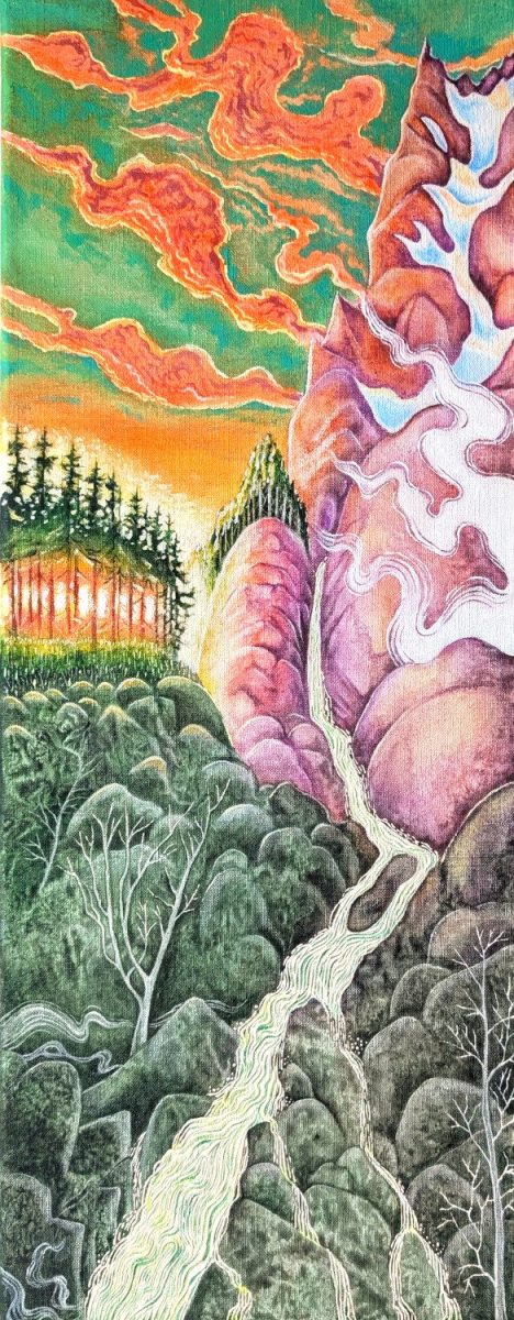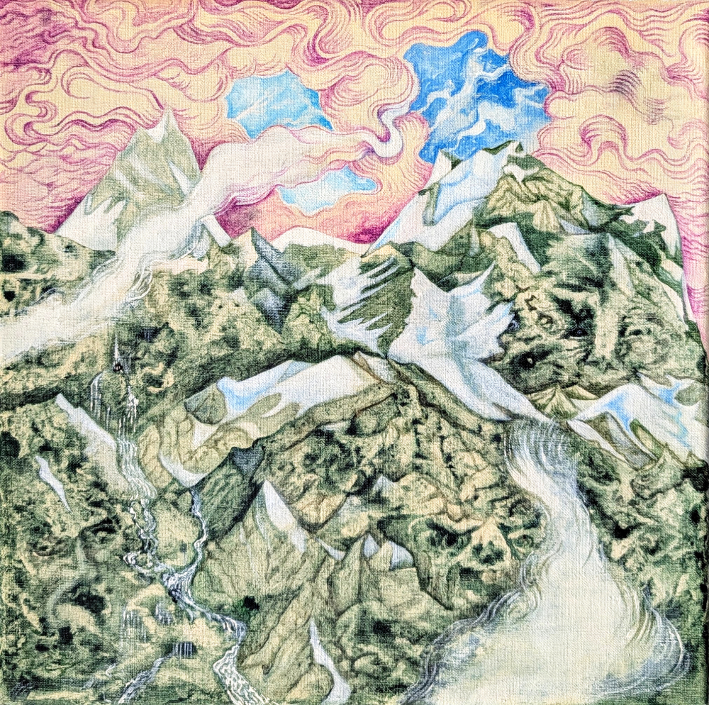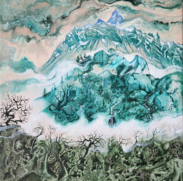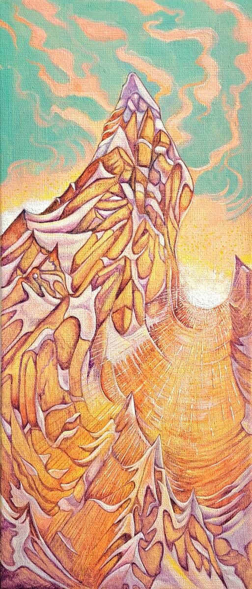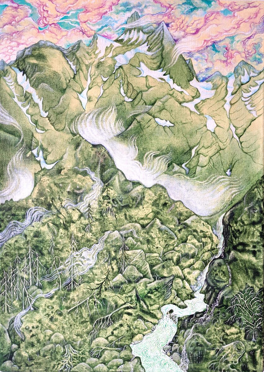 Mountainscapes Resurrection. 2025. Acrylic, oil and colourpencils on canvas. 50 x 20 cm. Nebelmeer. 2025. Acrylic and colourpencils on canvas. 30 x 30 cm Moribund. 2024. Acrylic on canvas. 40 x 40 cm Les Géants Sauvages. 2024. Acrylic and colourpencils on canvas. 30 x 30 cm Ginnungagap. 2024. Acrylic on canvas. 30 x 20 cm Prometheus. 2024. Acrylic, oil and colourpencils on canvas. 46 x 33 cm Beyond the Northwinds. 2023. Acrylic, oil and colourpencils on canvas. 58 x 25 cm Kali Yuga. 2023. Acrylic on canvas. 24 x 33 cm Requiem. 2022. Acrylic on canvas. 50 x 50 cm Erebus. 2022. Acrylic on canvas. 64 x 33 cm