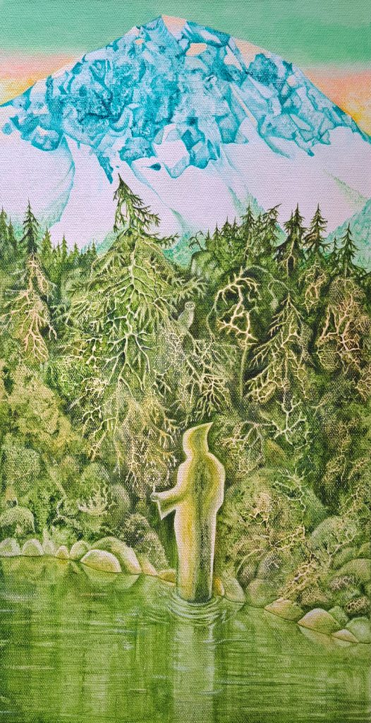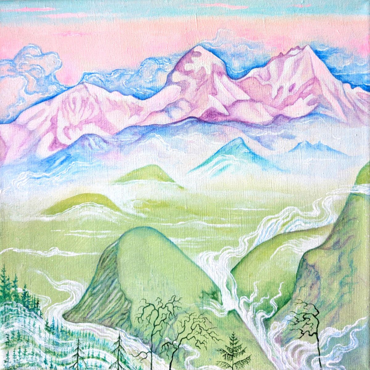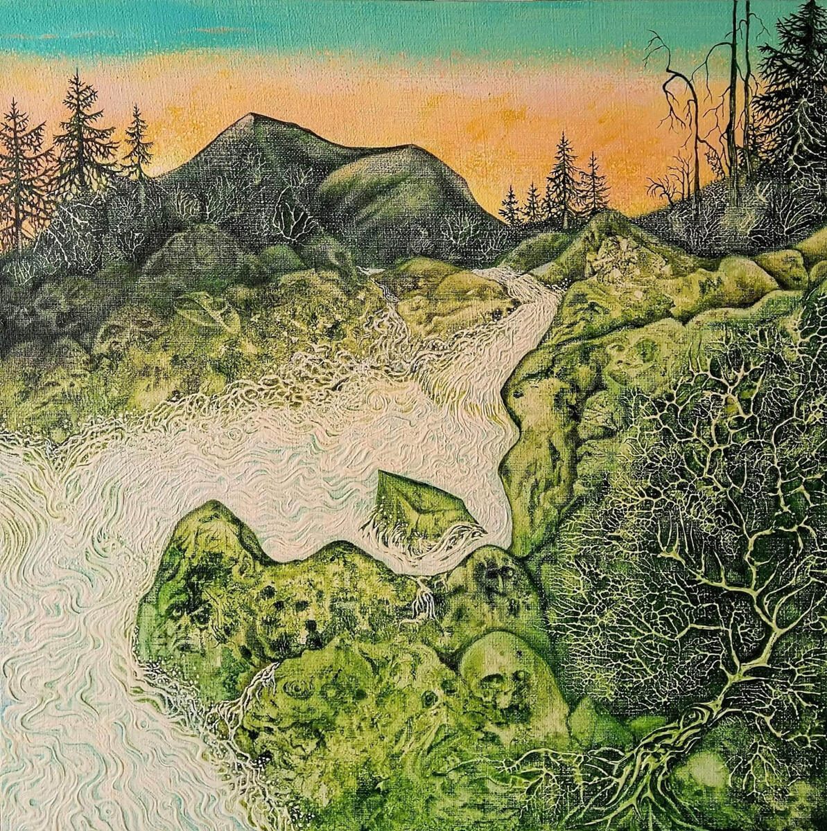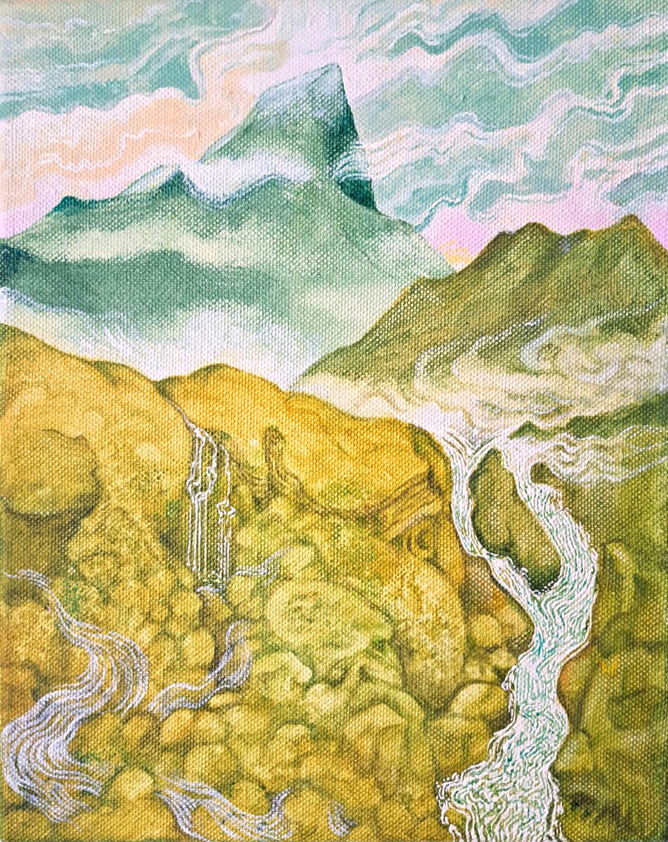 Mountainscapes Resurrection. 2025. Acrylic, oil and colourpencils on canvas. 50 x 20 cm. Nebelmeer. 2025. Acrylic and colourpencils on canvas. 30 x 30 cm Moribund. 2024. Acrylic on canvas. 40 x 40 cm Les Géants Sauvages. 2024. Acrylic and colourpencils on canvas. 30 x 30 cm Ginnungagap. 2024. Acrylic on canvas. 30 x 20 cm Prometheus. 2024. Acrylic, oil and colourpencils on canvas. 46 x 33 cm Beyond the Northwinds. 2023. Acrylic, oil and colourpencils on canvas. 58 x 25 cm Kali Yuga. 2023. Acrylic on canvas. 24 x 33 cm Requiem. 2022. Acrylic on canvas. 50 x 50 cm Erebus. 2022. Acrylic on canvas. 64 x 33 cm